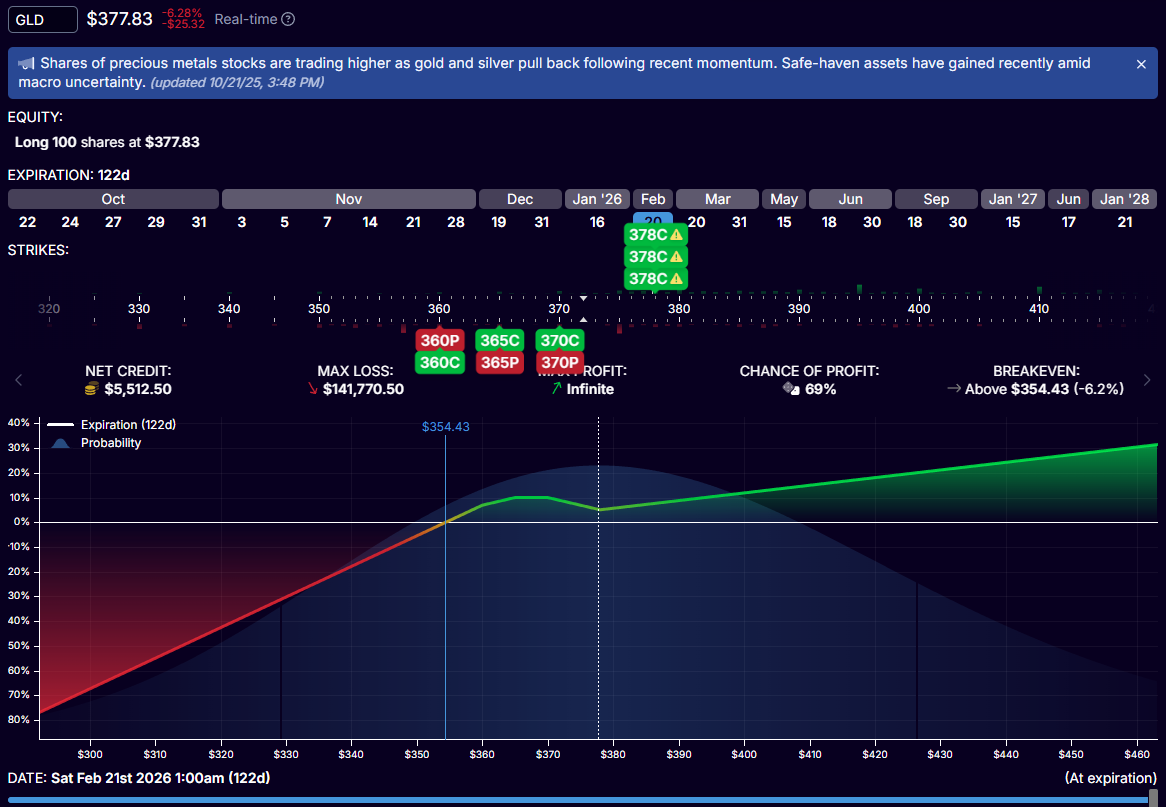 - Opportunities Through Options - We outline below two opportunities to replace current gold holdings, leveraging the options market. (1) A short put, 31 days out, at $370 on GLD yields 2% premium with a breakeven at $363, in sync with the support zone for GLD (2) A "buy-the-dip" options structure (see below), retains all upside while providing opportunities to accumulate at lower levels (avg. 6% lower)