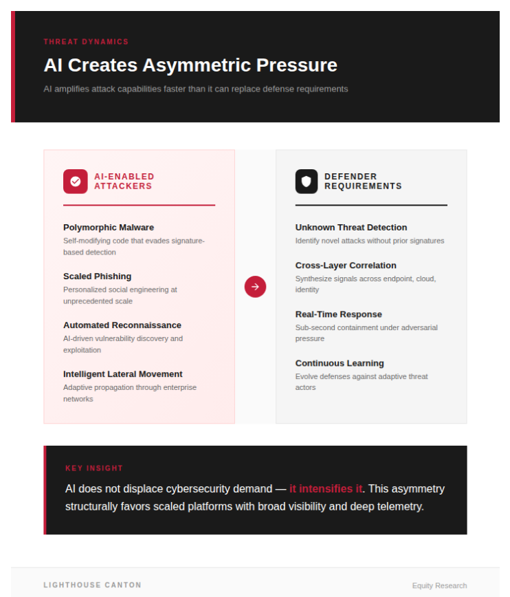 Defenders, by contrast, must detect unknown threats, correlate signals across endpoints, cloud, identity, and network layers, and respond in real time. This asymmetry structurally favors scaled cybersecurity platforms with broad visibility and deep telemetry.
