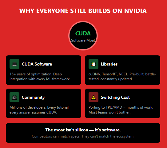 Despite Google's hardware and cost advantages, NVIDIA’s ecosystem gives it a huge edge. Its CUDA software platform is deeply embedded in the AI community, offering tools, libraries, and support that make it easy to develop and deploy models.