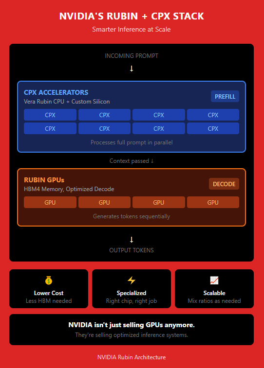 NVIDIA’s upcoming Rubin architecture introduces a new chip, the Rubin CPX, specifically for the prefill stage. This chip uses cheaper memory and focuses purely on raw compute. The decode part remains on the main, high-memory GPUs like Rubin or Blackwell.