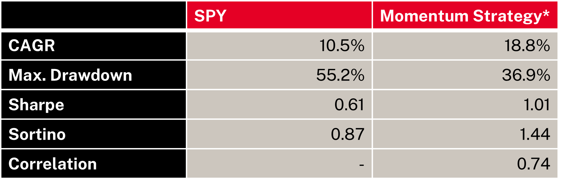 Our extensive back-tests* show a 18.8% CAGR (vs. 10.5% for S&P) with a lower max. drawdown of 37% (vs. 55% for S&P), delivering superior Sharpe and Sortino ratios.