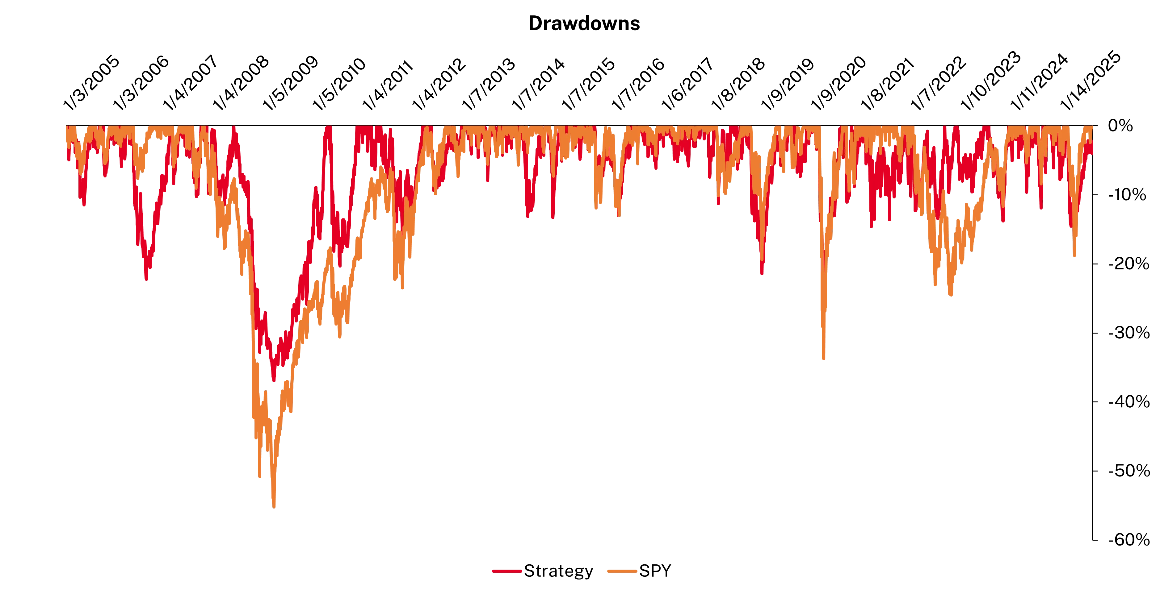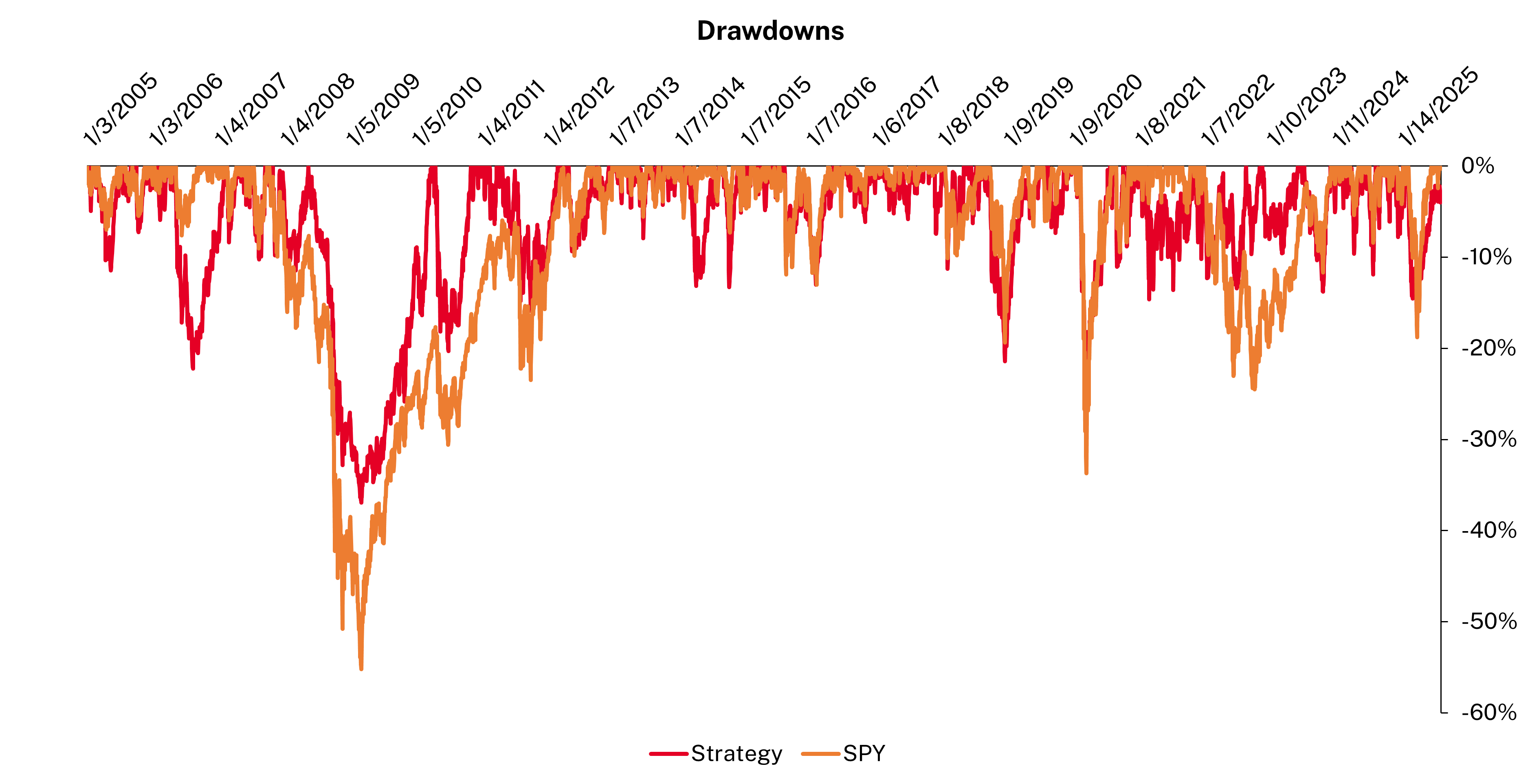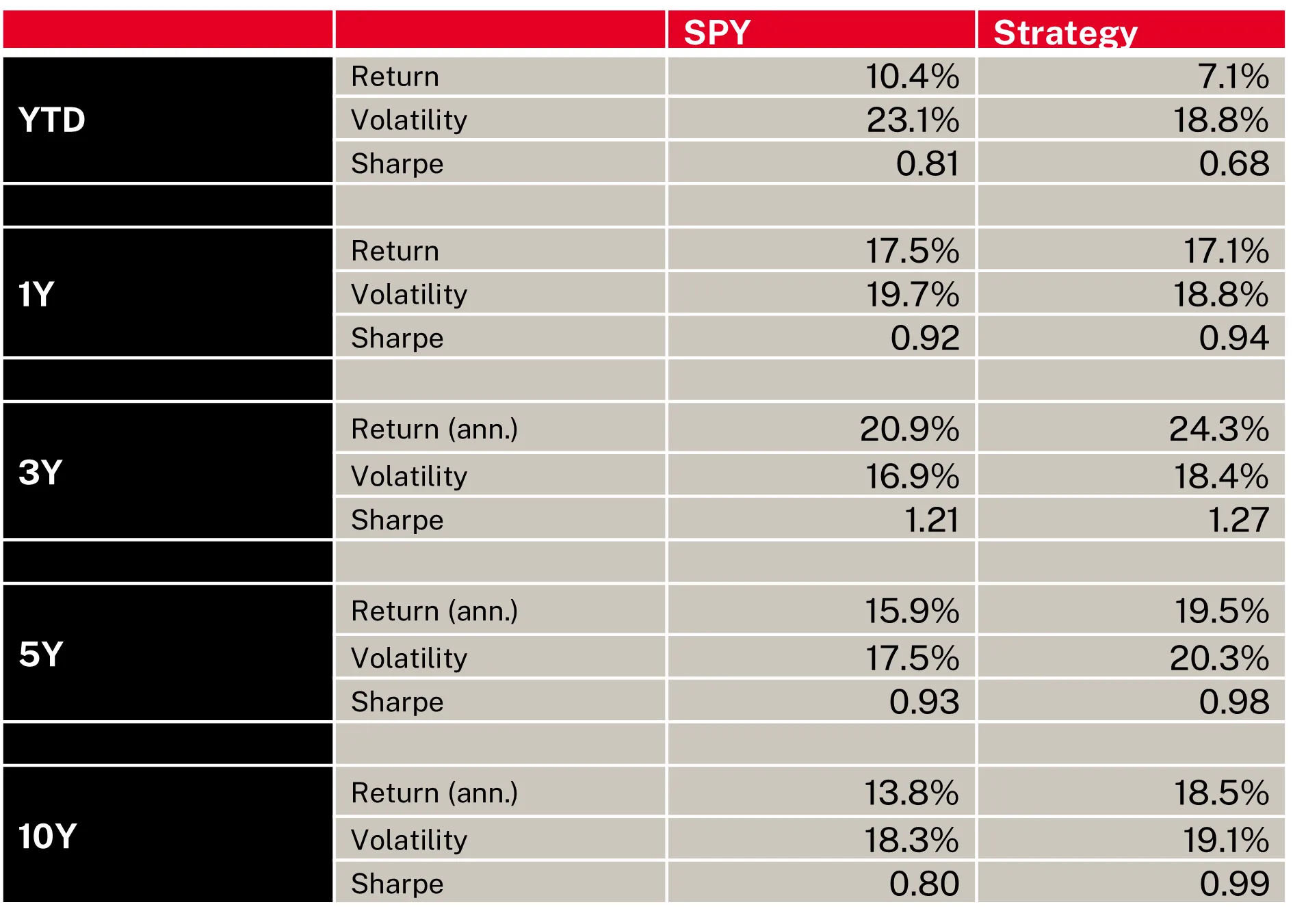 Crash Resilience: Q12020 drawdown limited to –27% versus –34% for SPY.