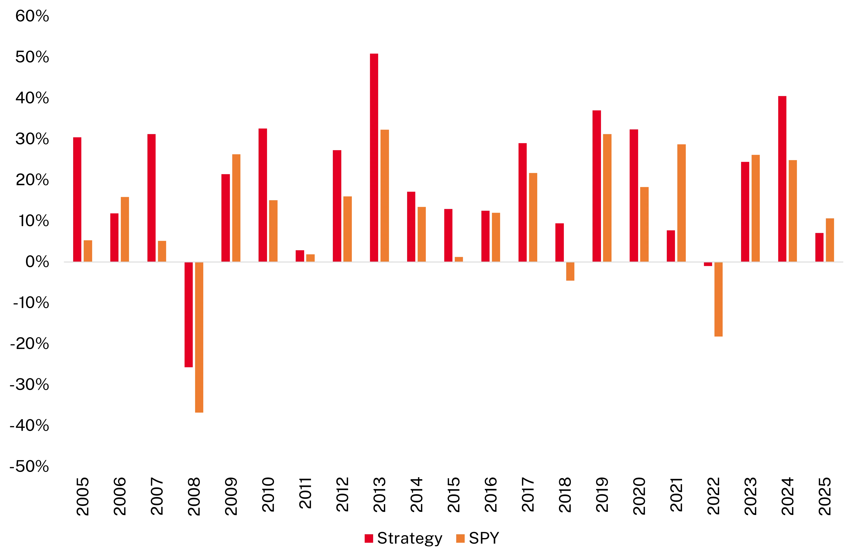 Consistent Outperformance: Strategy beats SPY in 16 of 21 calendar years.