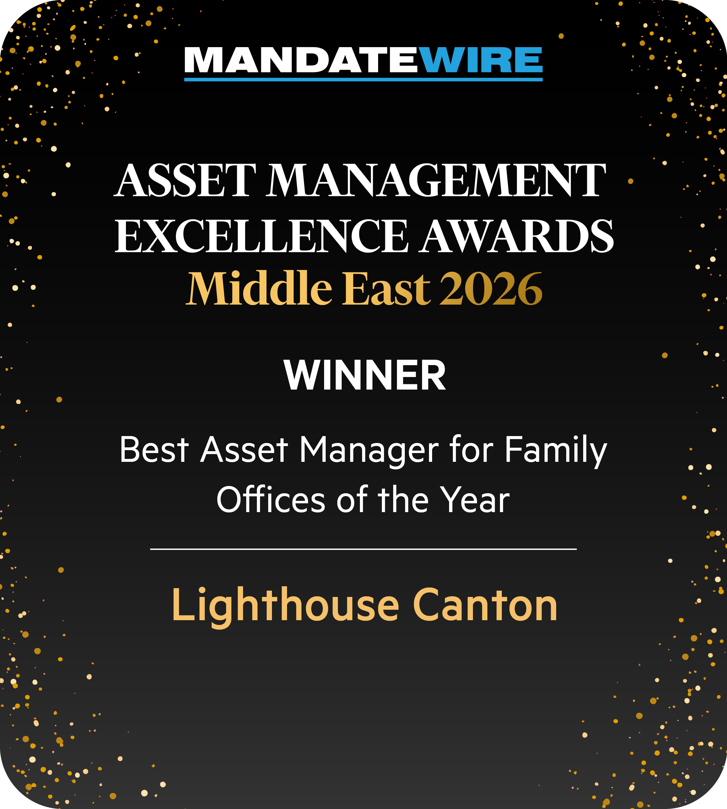 The Mandate Wire Awards – Asset Management Excellence Middle East recognize asset managers redefining excellence across the region. As the Middle East evolves as a global financial hub, these awards honour firms demonstrating outstanding achievement in performance, strategy, innovation, and leadership. Open exclusively to asset managers operating in or serving clients in the Middle East, the awards celebrate those shaping capital markets, supporting economic diversification, and driving long-term value creation across asset classes and investor segments. The award distinguishes Lighthouse Canton as one of the few independent institutions globally that combines institutional-grade asset management with comprehensive wealth advisory—delivering the sophistication of leading private banks with the flexibility and client alignment that only an independent platform can offer.