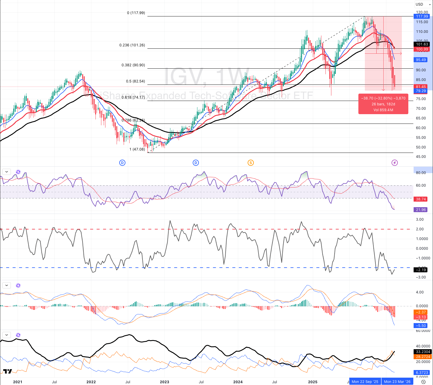The carnage is complete. IGV trading at 8.8 is down 33% in a near-vertical capitulation, now sitting at the 50% Fibonacci retracement level (Oct 22 lows to recent all-time high), after piercing below all relevant moving averages (20/50/200day) with violent momentum. BUT, it's deeply oversold - RSI at 22 and z-score over 2 std deviations below average are at 2022’s depressed levels, levels from where previous up-moves have started. MACD histogram is massively negative, showing extreme bearish momentum but starting to show very early divergence hints at these lows. Spiking volumes into the sell-off suggest capitulation – but is it exhaustion yet?