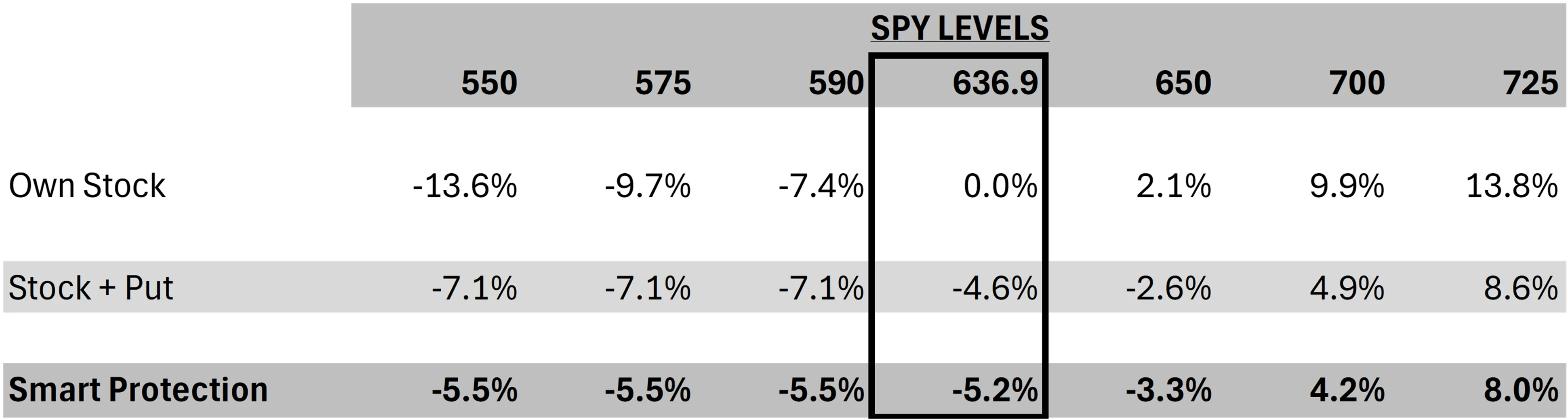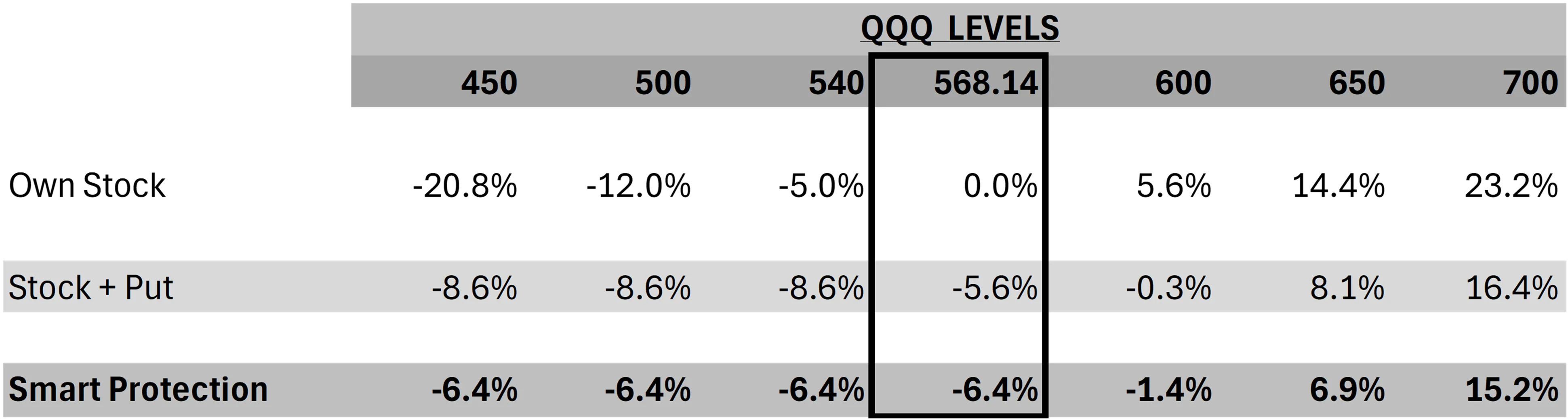 Vols are definitely depressed, making insurance cheap- but is there a smarter (and cheaper) way to buy insurance? In a world of put-call parity, there is no free lunch – but a lower upfront cost is certainly achievable (approx.. 34% lower for SPY and 39% for QQQ for a 97% protection). As with any insurance, there are trade-offs – this strategy is focused on lower upfront costs and more mindful of downside risk protection.
