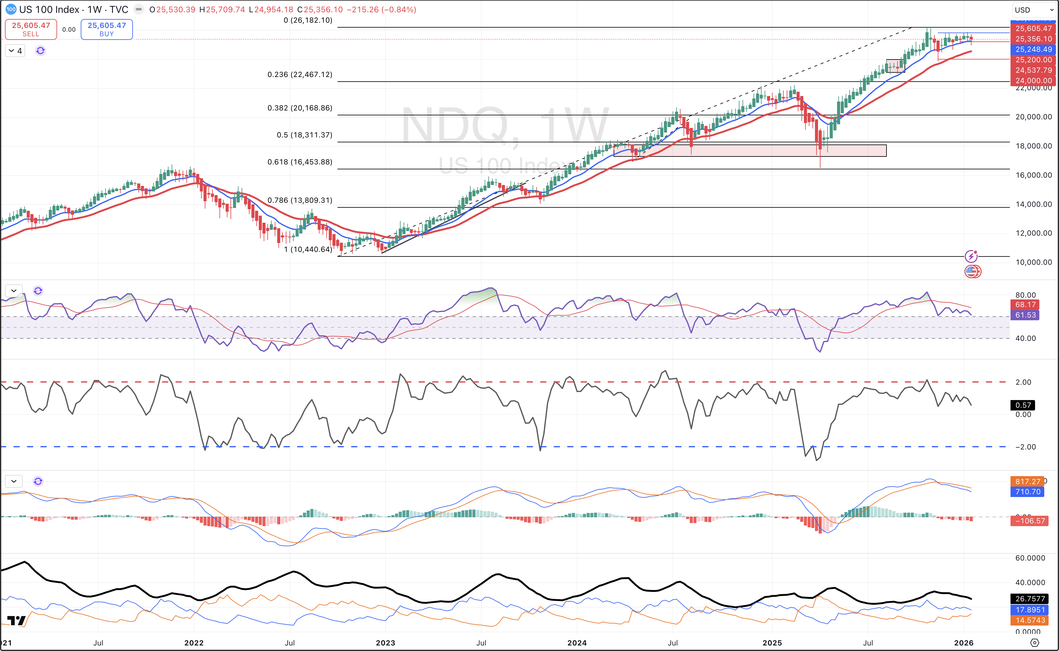 - Nasdaq 100 shows a market struggling to define clear direction, trading near recent highs around 25,600 but failing to break decisively higher.