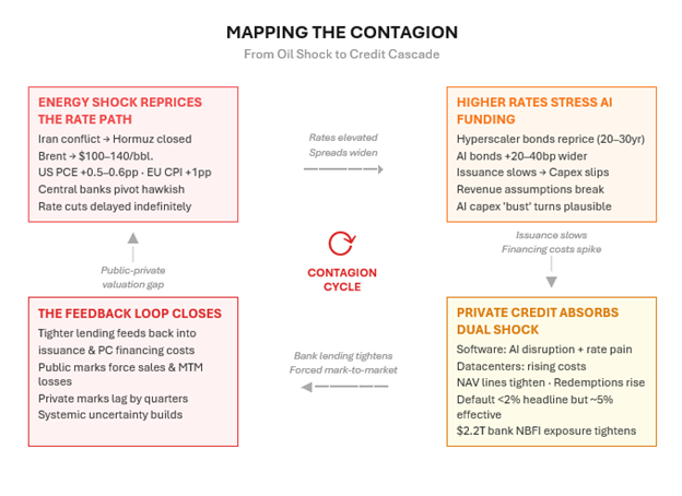 Global credit markets are being reshaped by three forces that, viewed individually, are each significant—but viewed together constitute the most dangerous cocktail for credit investors since 2007–08. The first ingredient is the largest corporate debt-financing cycle in history: over USD 120 billion of hyperscaler bonds issued in a single year, with potentially USD 1.5 trillion more to come, to fund an AI infrastructure buildout consuming nearly 100% of free cash flow. The second is a private credit ecosystem—now USD 3 trillion and systemically intertwined with banks and insurance—carrying concentrated software exposure precisely as AI disrupts those borrowers' business models, while simultaneously absorbing hundreds of billions in data-centre project debt. The third is a live geopolitical shock: the Middle East conflict that erupted in late February 2026, driving oil up, threatening Strait of Hormuz transit (if sustained could prove fatal for the credit markets), and forcing central banks away from the rate cuts that both the AI capex cycle and the private credit refinancing wall desperately need. None of these is a standalone risk. Each one intensifies the others. Together, they create a self-reinforcing repricing loop across investment-grade, high-yield, private credit, and emerging markets simultaneously. This note maps that loop.
